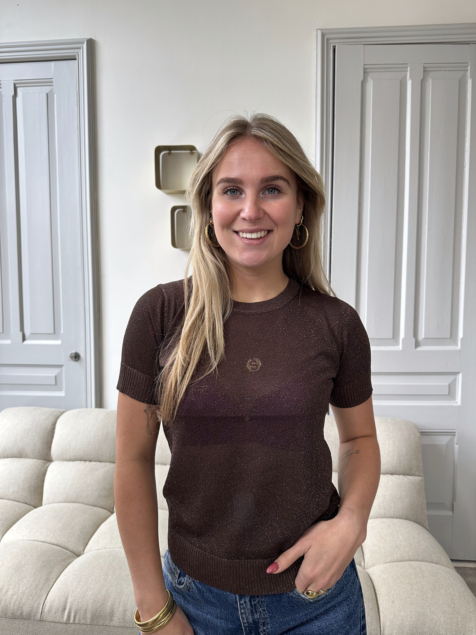 Bijzonderheden: Ronde hals, doorzichtig, bronskleurige glitter