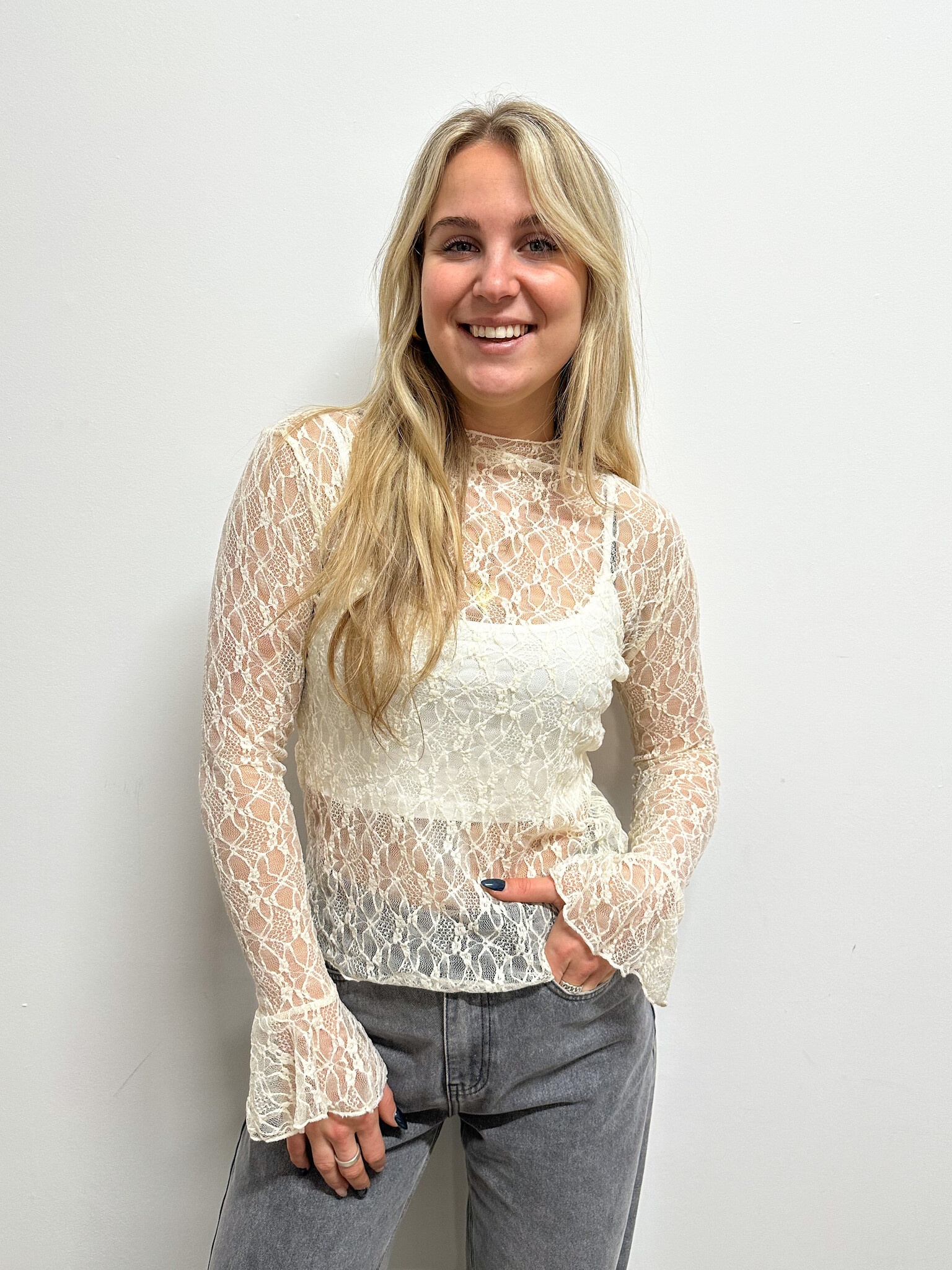 - Bijzonderheden: De top is doorschijnend, heeft lange mouwen die wijd uitlopen, iets hoger kraagje