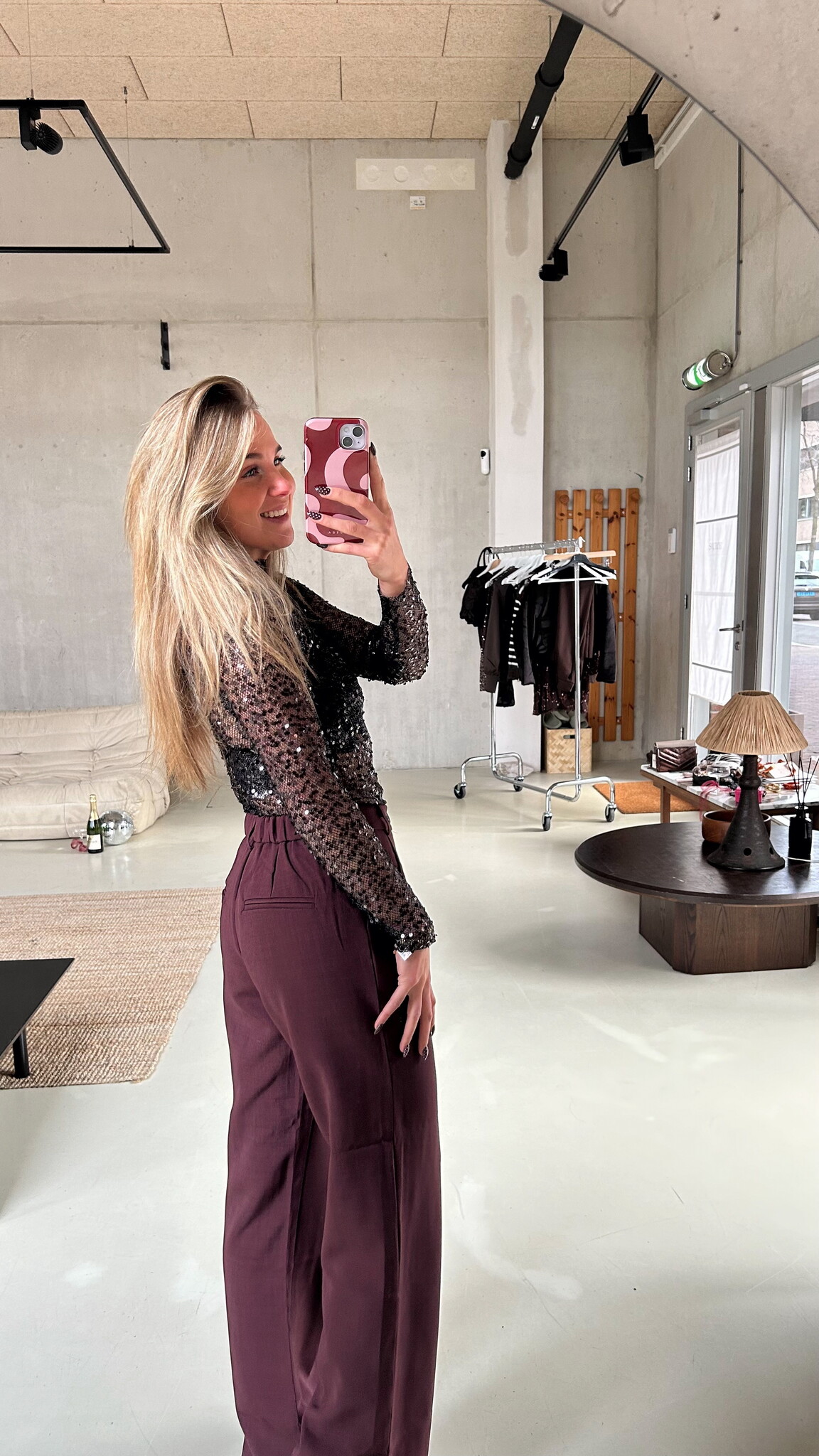 - Bijzonderheden: De broek heeft wijde pijpen, broekzakken, riem lussen