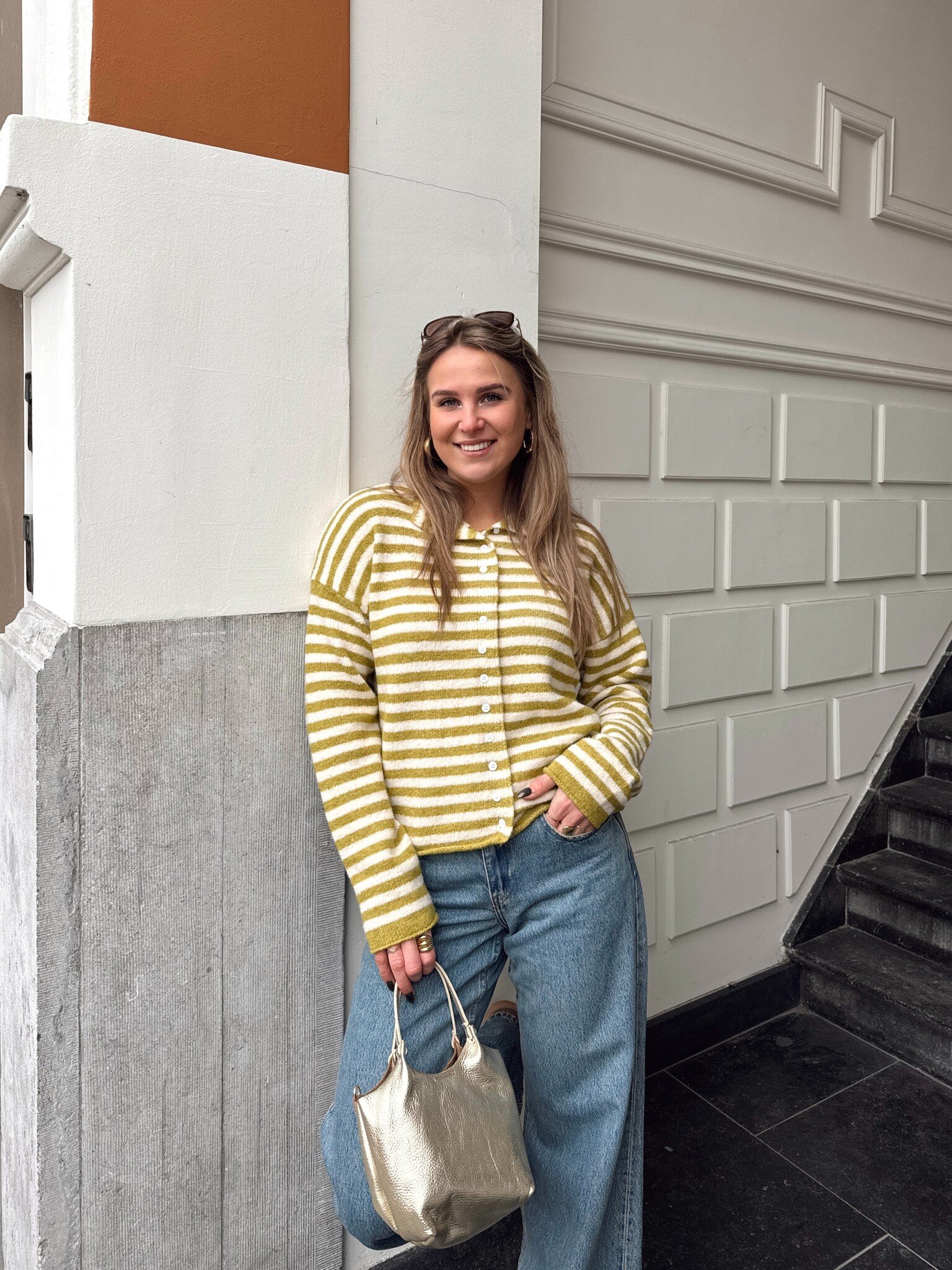 - Bijzonderheden: De knit heeft leuke knoopjes details wat doorloopt tot een hoge kraag, deze kan je zo ver als je wilt open of dicht dragen