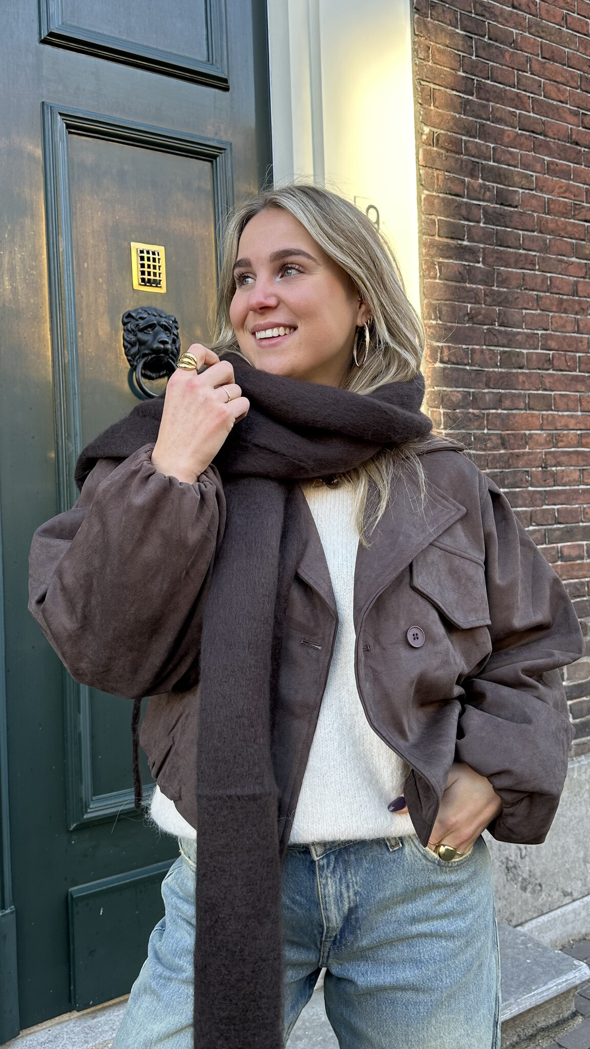- Bijzonderheden: Kraag, bruine knopen, bomber model